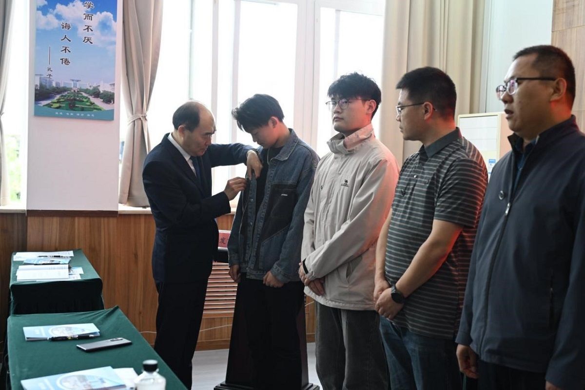 伟德国际1946直属党支部书记殷战稳为新生代表佩戴校徽。一枚枚校徽承载着“厚德 唯实 博学 慎思”的校训精神,象征着新生正式成为公司共同体的一员。
