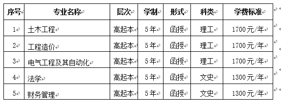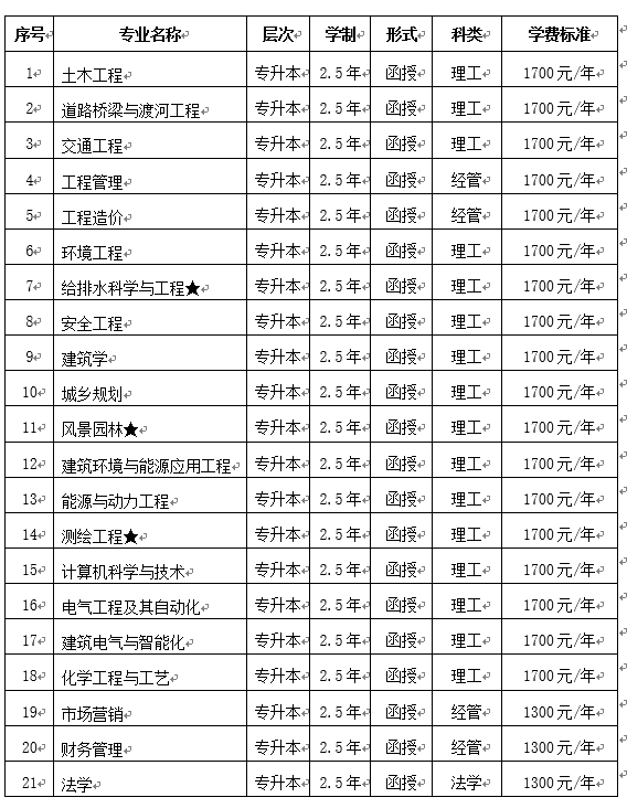 注:(1)高起本:全国成人高招考试总分均为600分。(2)专升本:总分为450分。(3)其中带“★”专业在录取时可降低20分投档;年龄超过25周岁者的考生在录取时可在考试成绩基础上增加20分投档。