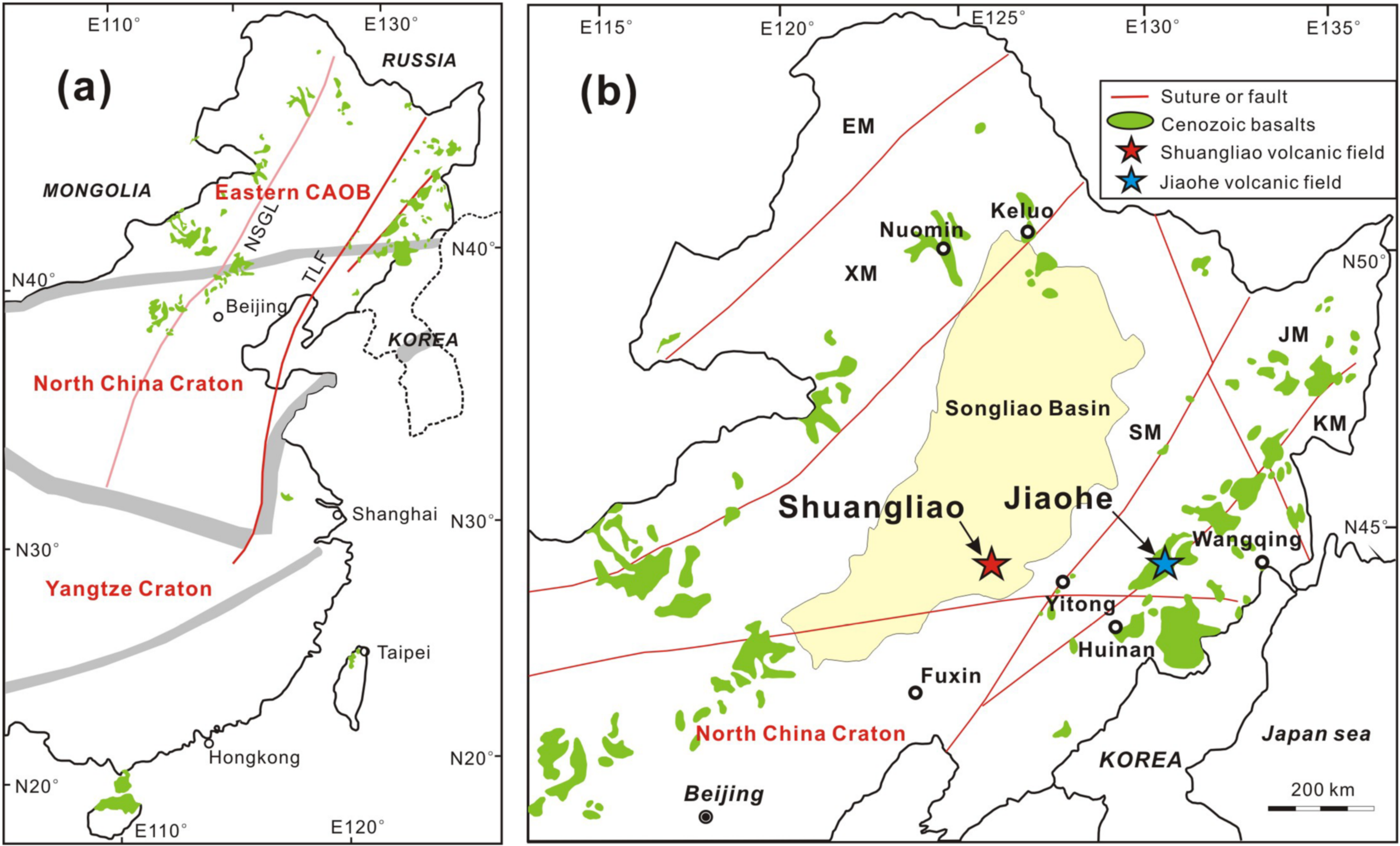 图1.(a)中国东部新生玄武岩分布简图;(b)东北地区构造简图及采样点
