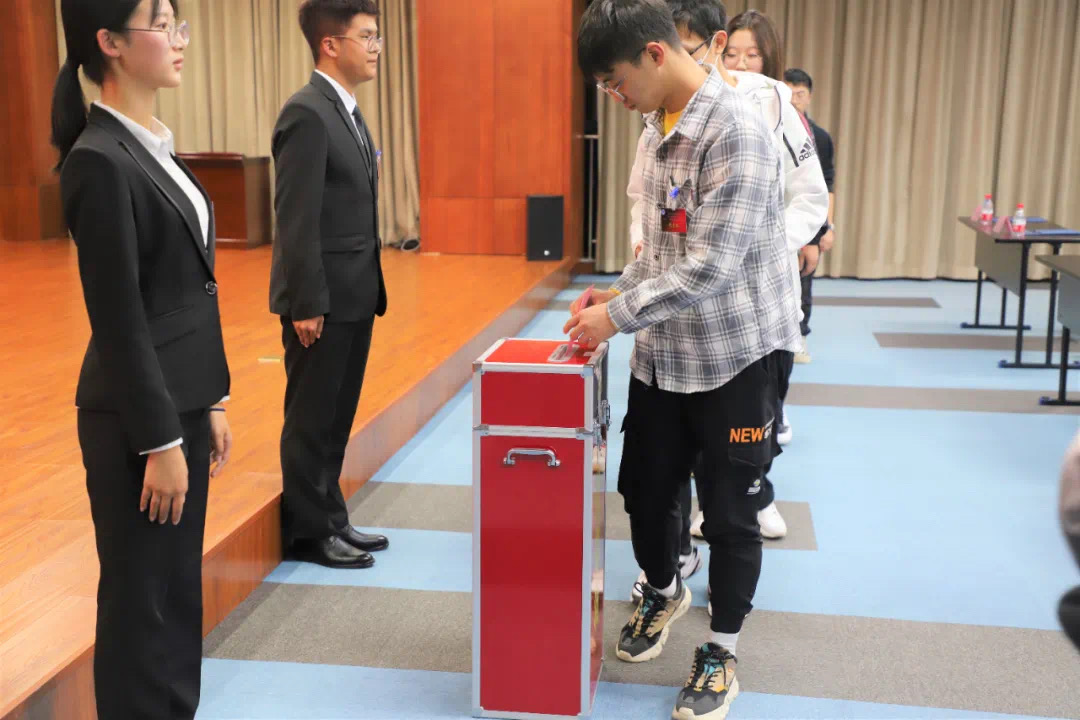 在候选人竞选演讲后,现场全体正式代表进行民主投票,投票过程秉持公平、公正的原则,投票结束后,由监票人、计票人收取选票进行核算。最后,陈思曈、张雅淇、郭文韬、刘春龙、李妍、高心如6名同学成功当选太阳成集团tyc7111cc第二十二届员工组织主要负责人。