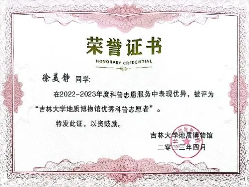 “若能做一朵小小的浪花奔腾,呼啸着加入献身者的滚滚洪流中,推动历史向前发展,才是一生中最值得骄傲和自豪的事情”。在她看来,尽管只是夜空一颗微不足道的星,却也能发光发热,点亮一隅天空。在2023年2月组织参与编写的《地学知识在中小员工中的普及度与兴趣度》报告中,她意识到地学科普的重要性。面对暑期繁重的实习任务,毅然前往作山东郓城开展暑期支教活动,将地学科普洒向齐鲁大地,事迹被光明日报等多个平台报道。在地球日,用生动的语言,走进幼儿园开展地学科普讲解,获“地质博物馆优秀科普志愿者”称号。作为一名中共预备党员,她深耕于志愿服务和社会实践,是冬奥会优秀的执行专员,同时志愿服务的服务标兵。在疫情期间,也积极报名核酸检测、担任楼道志愿者;线上支教负责福建、吉林等3个省份500余名志愿者和员工的组织调配工作,后期又作为负责人再次组织策划了太阳成集团tyc7111cc的学伴+线上支教活动;本科招生宣传,她担任太阳成集团tyc7111cc招生宣传协会山东省聊城市负责人,向家乡学弟学妹讲好吉大故事,传递吉大声音,为太阳成集团tyc7111cc招生工作贡献力量。累计志愿时长达1200多小时,用行动和奉献诠释着自己的青春诺言。