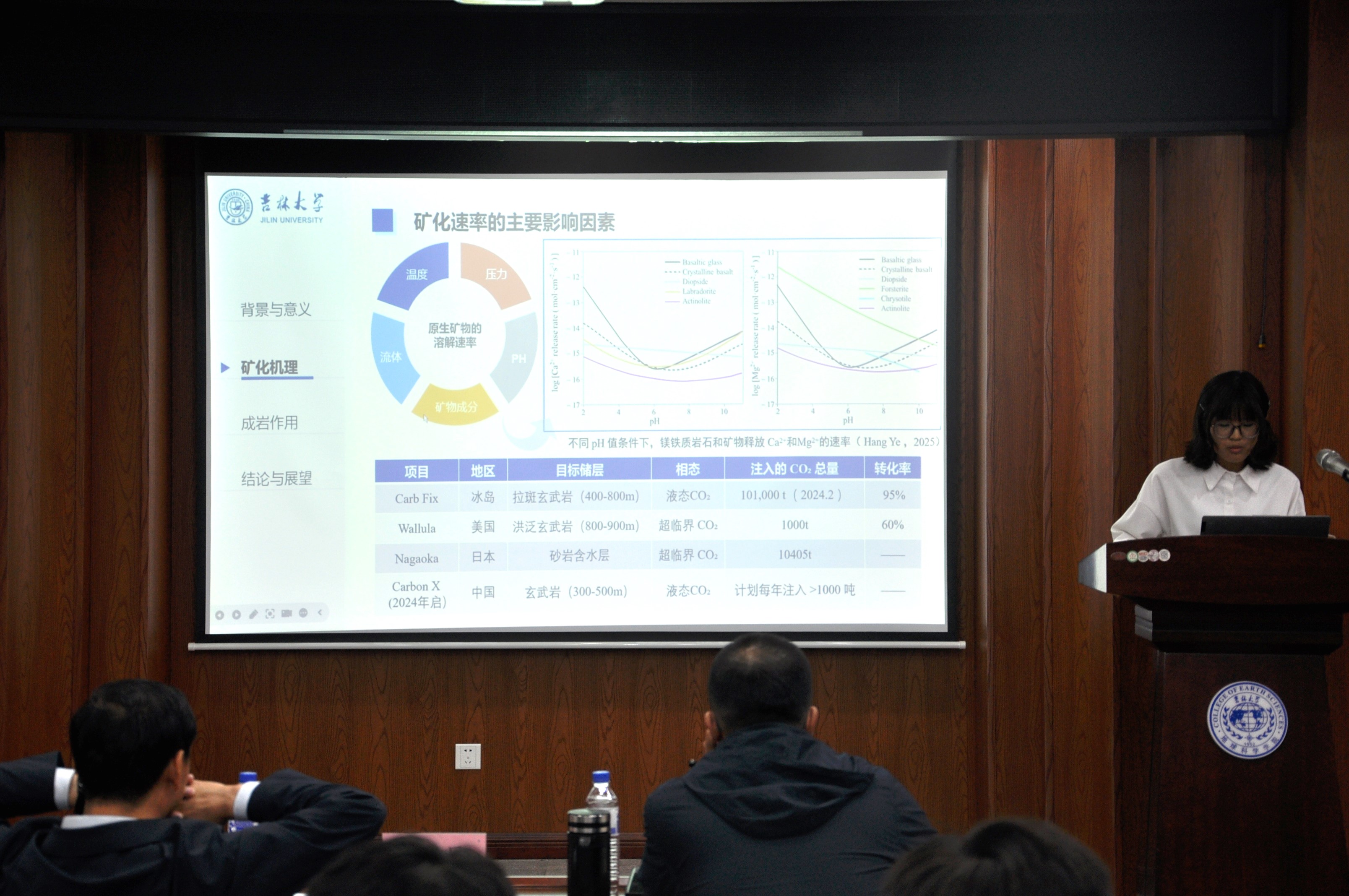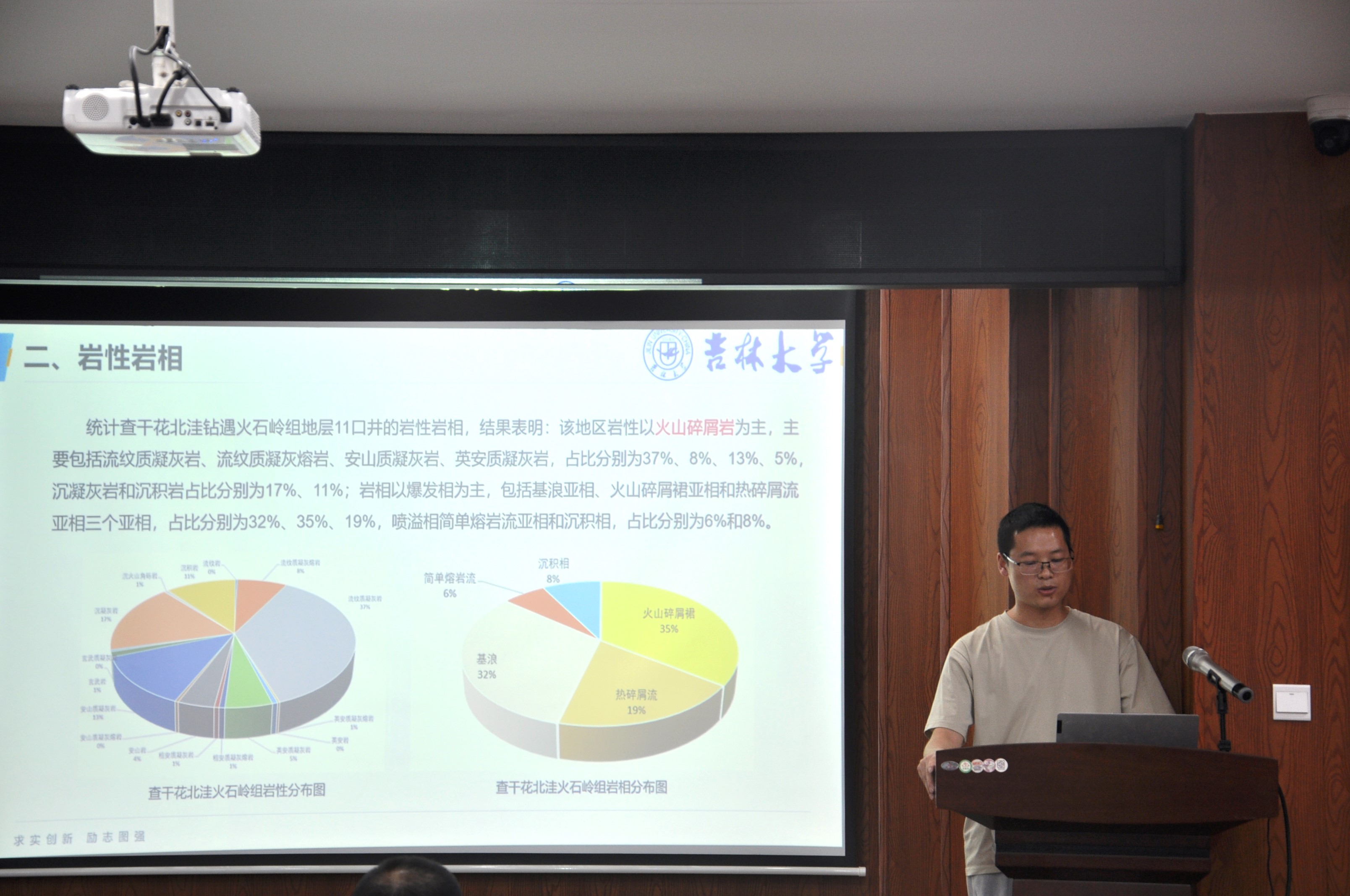 活动上,冯永博同学横向对比全球51个富油气超级盆地勘探进展与构造演化并阐述规律特征,张亚东同学对全球51个富油气超级盆地烃源岩进行横向对比并阐释规律,付琦同学则对全球51个富油气超级盆地盖层展开横向对比并解析规律特征;董自强同学分析查干花次凹火石岭组火山碎屑岩储层的岩性岩相、储集空间类型及构造环境,建立“构造-风化-岩相”三元耦合控储模式;李媛媛同学运用高压压汞和核磁共振技术联合表征储层全尺度孔隙结构特征,研究孔喉分形特征及分形维数与储层物性、孔喉结构参数的关系;张莹同学探讨松辽盆地火山岩相模式及其储层意义,纪泽雨同学研究浮岩和火山尘对火山碎屑堆积物机械压实的影响;李馨瑜同学系统综述玄武岩中CO₂矿化的基本机理、岩性与矿物学差异对矿化效率的影响及不同类型玄武岩的封存特征对比,为工程应用提供理论与实践参考;于雨桐同学研究东海盆地西湖凹陷火成岩储层特征,明确优质储层特点、控制因素及成因并建立储层分布模式;黄昱皓同学探讨上沧-华蓥山-沙腔地区峨眉山玄武岩主微量分析及构造环境推断,马梦南同学结合钻井地球化学特征与岩心精细观察建立峨眉山玄武岩组地层序列和形成发育模式。