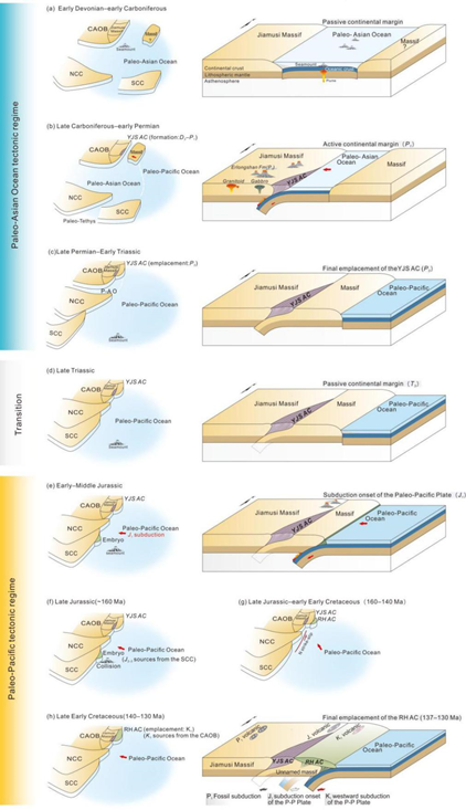 晚古生代和中生代陆缘增生杂岩与同期沉积建造和火成岩组合及其时空变异一起共同揭示了东北亚陆缘晚古生代–中生代的构造演化史,包括两个阶段:1)古亚洲洋构造体制阶段主要表现为晚古生代早期的被动大陆边缘、早二叠世的活动大陆边缘、三叠纪的构造转换期(图4a,b,c)。佳木斯地块东缘晚泥盆世—晚二叠世期间存在一个微陆块间的古大洋;2)古太平洋构造体制阶段主要经历了早侏罗世古太平洋板块的起始俯冲(图4e)、晚侏罗世–早白垩世早期的小角度斜向俯冲(图4f)和晚中生代的持续西向俯冲以及俯冲板片的后撤过程(图4h)。