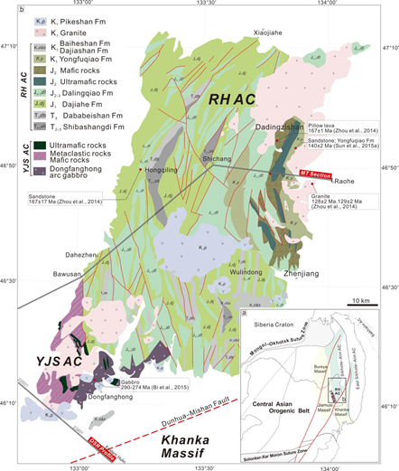 跃进山杂岩中的变镁铁质—超镁铁质火成岩被弧型辉长岩(290–274 Ma)所穿切,表明其形成时代早于晚二叠世。跃进山杂岩遭受了低绿片岩相变质作用和强变形的改造,最终构造就位发生在晚二叠世。相反,饶河杂岩中的岩石组合并没有遭受变质作用的改造,其中MORB型玄武岩和堆晶辉长岩形成于中侏罗世(169–167 Ma),并发育有晚侏罗世和早白垩世早期的陆源碎屑岩,它们共同被早白垩世晚期花岗岩(约130 Ma)所穿切。由此表明,饶河杂岩最终构造就位发生在早白垩世晚期。