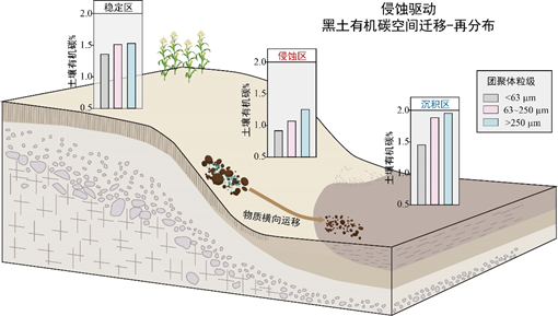 (3)在坡面尺度对土壤侵蚀驱动黑土有机碳空间“迁移-再分布”的机制进行了研究,通过分析坡面侵蚀区和沉积区土壤团粒结构、各粒级SOC含量的动态变化,揭示了土壤侵蚀与土壤团聚作用的耦合过程造成的SOC巨大空间差异,沉积区SOC含量两倍于侵蚀区(图3)。