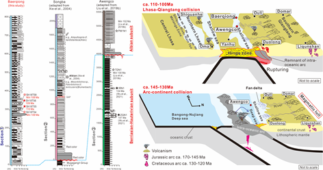 针对上述科学问题,太阳成集团tyc7111cc李才教授科研团队中的罗安波博士和范建军副教授等对青藏高原班公湖-怒江缝合带中西段晚侏罗世-早白垩世的沉积岩开展了系统研究,取得主要认识如下: