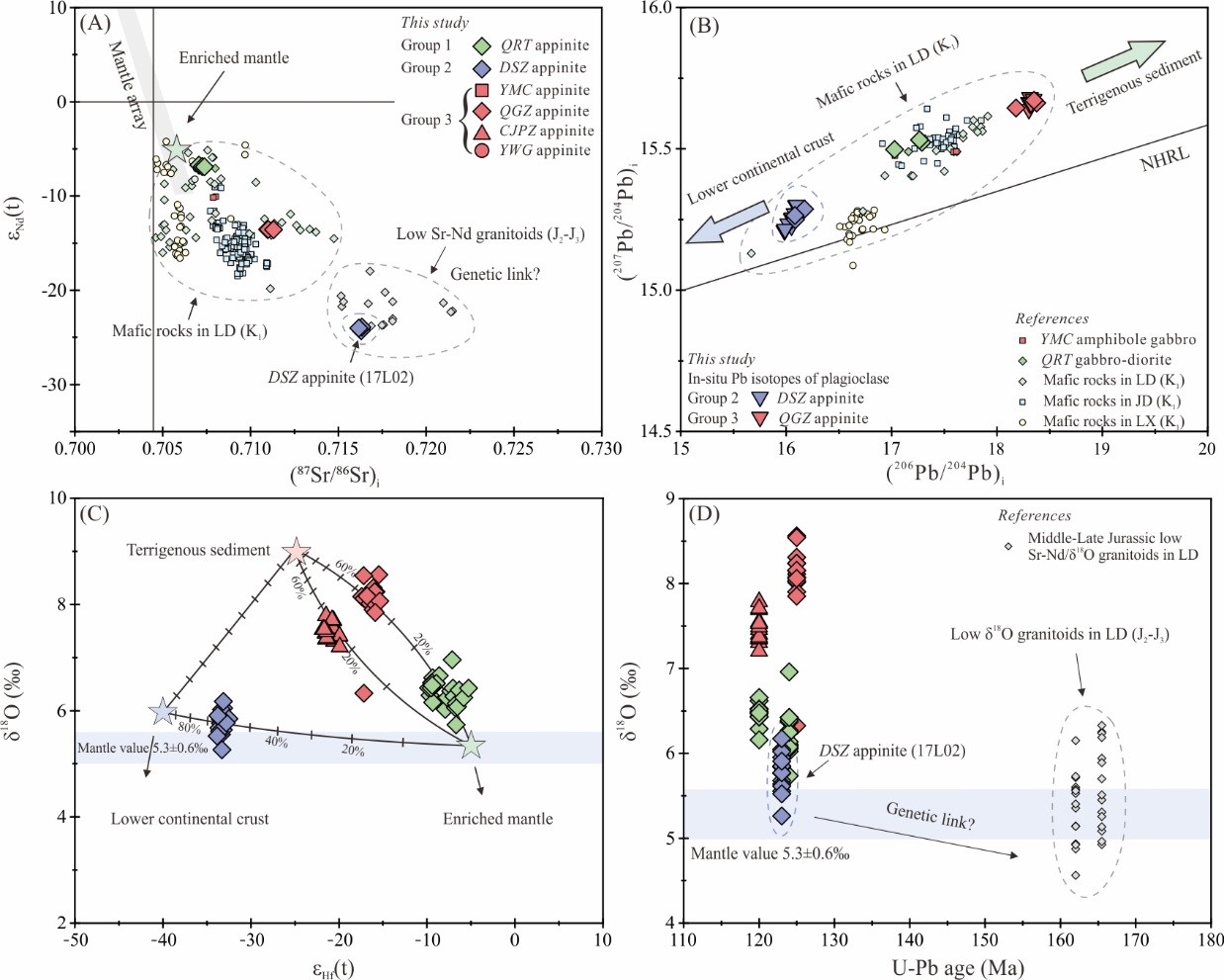 针对上述科学问题,太阳成集团tyc7111cc许文良教授团队的博士研究生闫相宇和杨德彬教授(通讯作者)等人,对华北克拉通东部辽东半岛地区早白垩世六个富闪侵入岩体(图1)进行了锆石U-Pb年代学,全岩主微量元素及全岩Sr-Nd-Pb同位素,并结合锆石Hf-O同位素及原位斜长石Pb同位素的系统研究(图2),得到如下认识:
