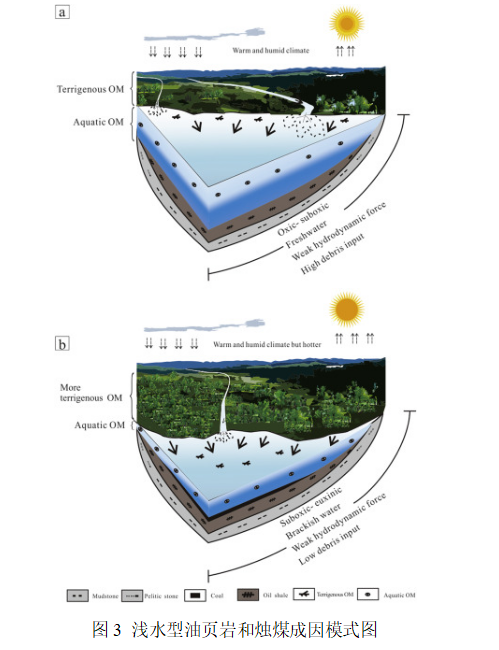 根据我国陆相盆地油页岩赋存特征,识别出深水和浅水两种类型的油页岩矿床,并以抚顺盆地西露天组和大长沟盆地八道湾组浅水油页岩为实例开展有机质富集机制研究,总体表明水陆生态变化及有机质来源的更替(图3)、浅水蒸发咸化是控制浅水型油页岩发育厚度、品质和展布特征的关键因素。