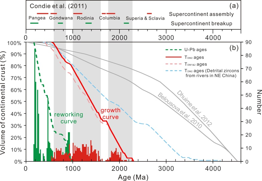 地球区别于其他类地行星的重要标志是其具有演化所形成的长英质大陆地壳。大陆地壳形成的机制和速率等一直是地球科学领域研究的前沿与核心问题。超大陆的旋回历史与大陆地壳的生长与演化过程密切相关,这也被地球历史上周期性分布的地质记录所证实,包括花岗岩和碎屑锆石的结晶年龄、地幔柱、大火山岩省和绿岩带的形成年龄等等。然而,目前关于全球大陆地壳生长模式的主流观点是,现今大陆地壳的主体是在 ~ 2.5Ga之前就已形成,并且具有渐进式生长的特点,这与地球历史上幕式分布的岩石组合和地质事件形成了鲜明对比。这种现象的产生可能是由于前人的研究大多聚焦于克拉通地区,而对造山带陆壳增生方式及造山带内不同构造单元陆壳演化的研究却涉及较少。