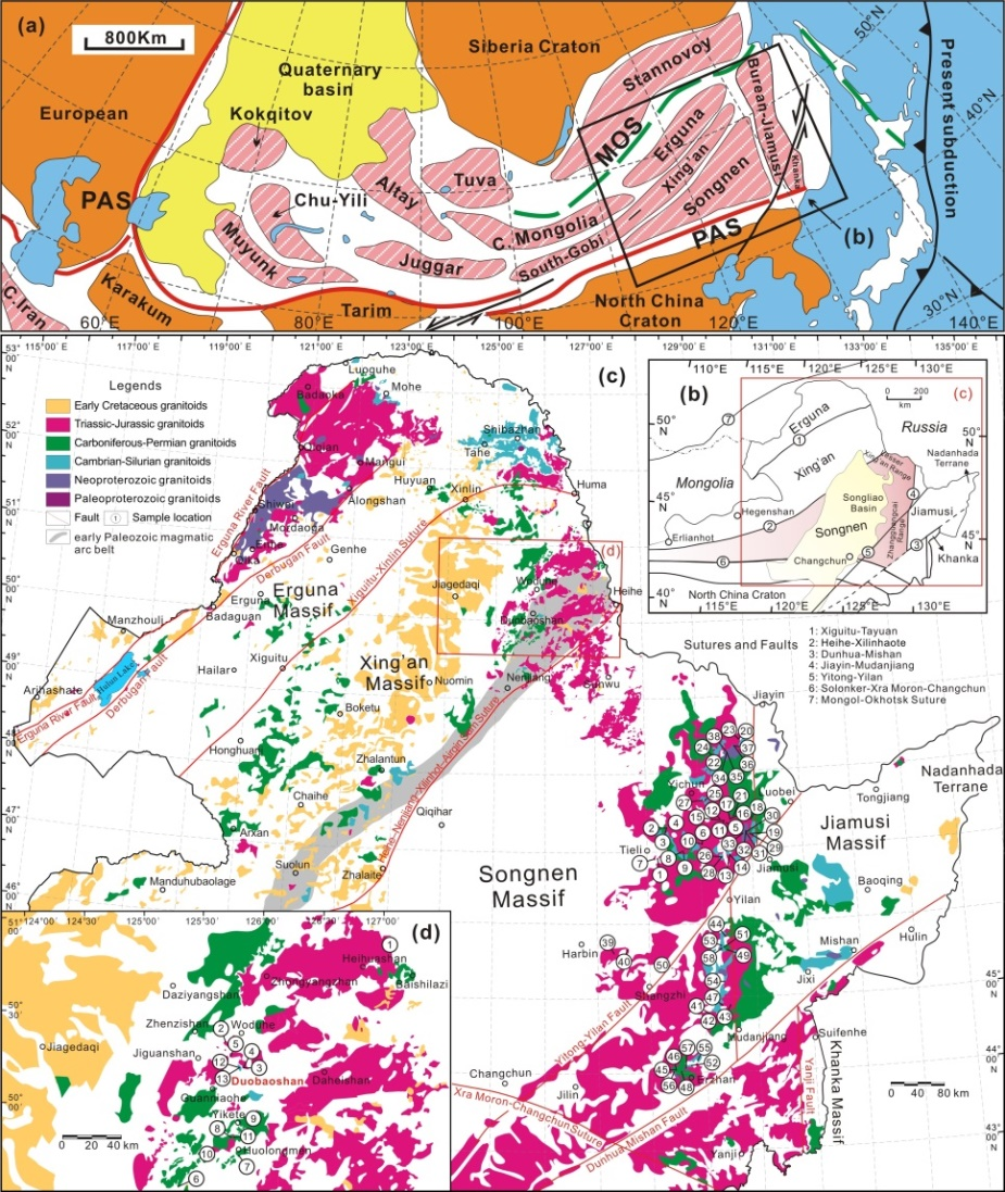 针对上述问题,太阳成集团tyc7111cc许文良教授团队的博士研究生龙欣雨和唐杰副教授(通讯作者)等人,对中亚造山带东段的松嫩地块和多宝山岛弧地体上广泛分布的花岗质岩石(图1)开展了系统的锆石U-Pb年代学、全岩地球化学和锆石Hf同位素研究,利用花岗岩的结晶年龄和模式年龄,建立了中亚造山带东段的地壳生长模型。取得了以下主要认识: