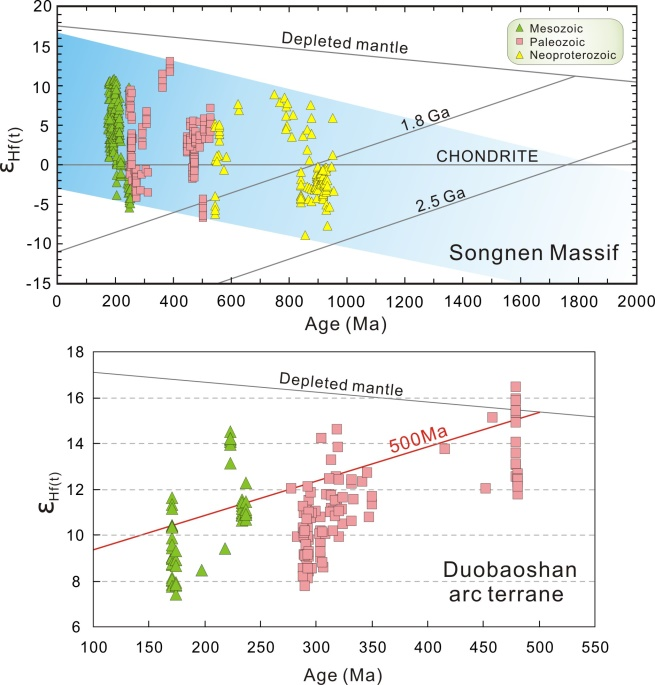 (1)松嫩地块的花岗质岩石主要形成于新元古代至中生代(图2),其古老的Hf/Nd同位素模式年龄表明松嫩地块是中亚造山东段具有前寒武纪结晶基底的一个古老微陆块,不同期次花岗质岩浆的产生经历了从古老下地壳物质熔融到新增生下地壳物质熔融的变化过程。且在空间上表现出地壳组成的不均一性——即由南向北,松嫩地块的古老陆壳成分逐渐增多。