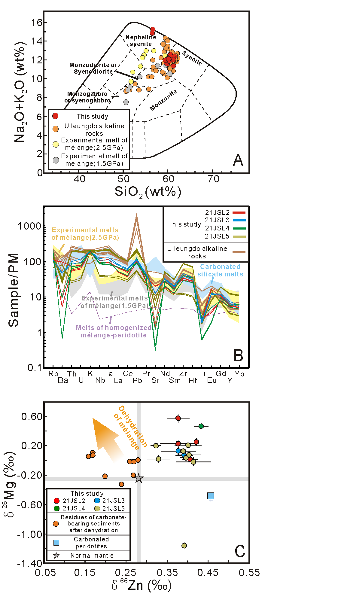 1. 证实了中国东北地区渐新世霓霞正长岩的混杂岩底劈熔融成因。霓霞正长岩的主微量元素组成具有与天然混杂岩实验熔体相同的趋势特征(图2A和2B);尤为重要的,样品表现出混杂岩熔融过程所特有的Hf-Nd显著分馏但Nd同位素组成几乎不变的特征 (图3A)。此外,样品具有显著重于地幔的Mg同位素组成,与推测的经历过脱水作用的混杂岩组分相一致(图2C)。