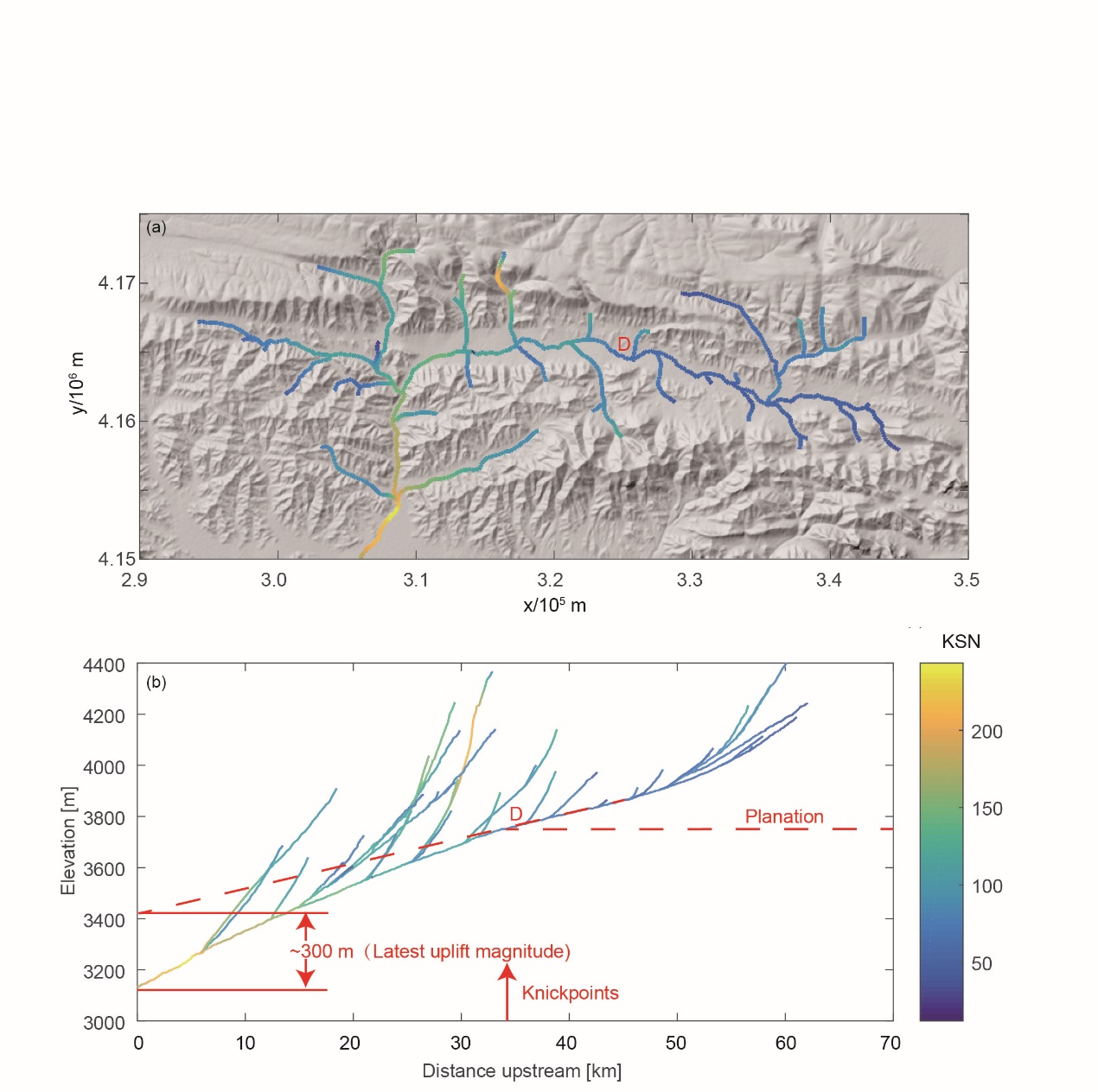 1. 东昆仑山前地区的典型代表性河流如那棱格勒河、格尔木河、香日德河受到了左行走滑的东昆仑断裂带的显著影响,在河流纵剖面上呈现异常的水平段,在平面上形成显著的偏移。高的河流陡峭指数也集中分布在东昆仑断裂和东昆仑山前之间(图1)。