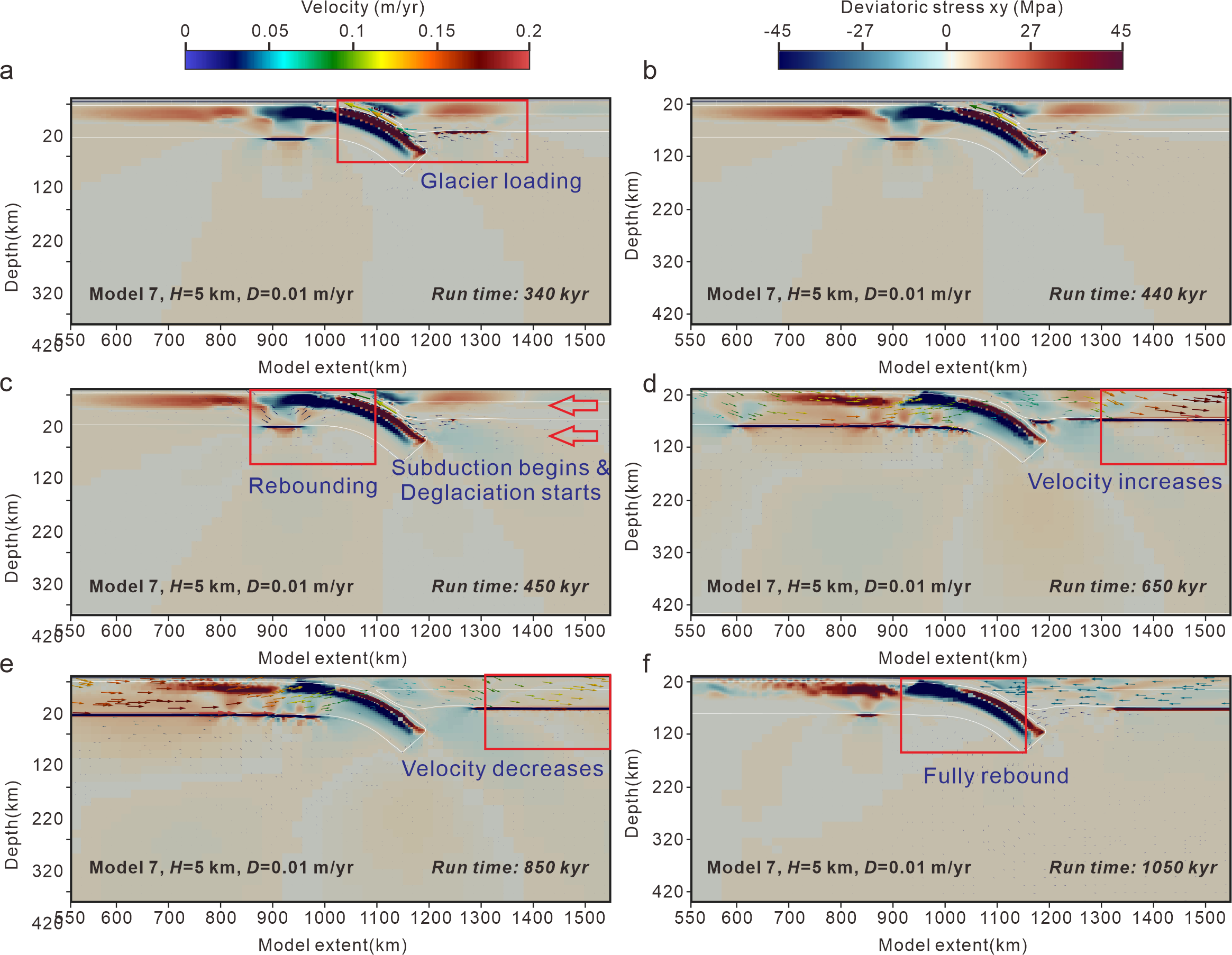 2.揭示了冰川消融对俯冲动力学的阶段性影响。主要划分成三个阶段,阶段一(图4a-b):冰川持续积累至最大厚度(5 km),垂直应力增加,上覆板块以<10–5 m/年速度下沉。上覆板块受压推动大洋板块前端,导致海沟初始位置东偏20–30 km。俯冲界面摩擦应力增强(位错蠕变效应),抑制板片回撤,与经典理论一致。阶段二(图4c-d):冰川消融开始与板片反弹。反弹首先发生于大洋板块前端(模型900–1000 km处),随后沿地壳扩展。大陆板块因反弹前移,抵消俯冲作用,导致板片短暂变浅,俯冲速度受反弹强度调控。阶段三(图4e-f):冰川完全消融后调整恢复至稳态。消融完成后,反弹效应终止,地幔对流速率回归正常。
