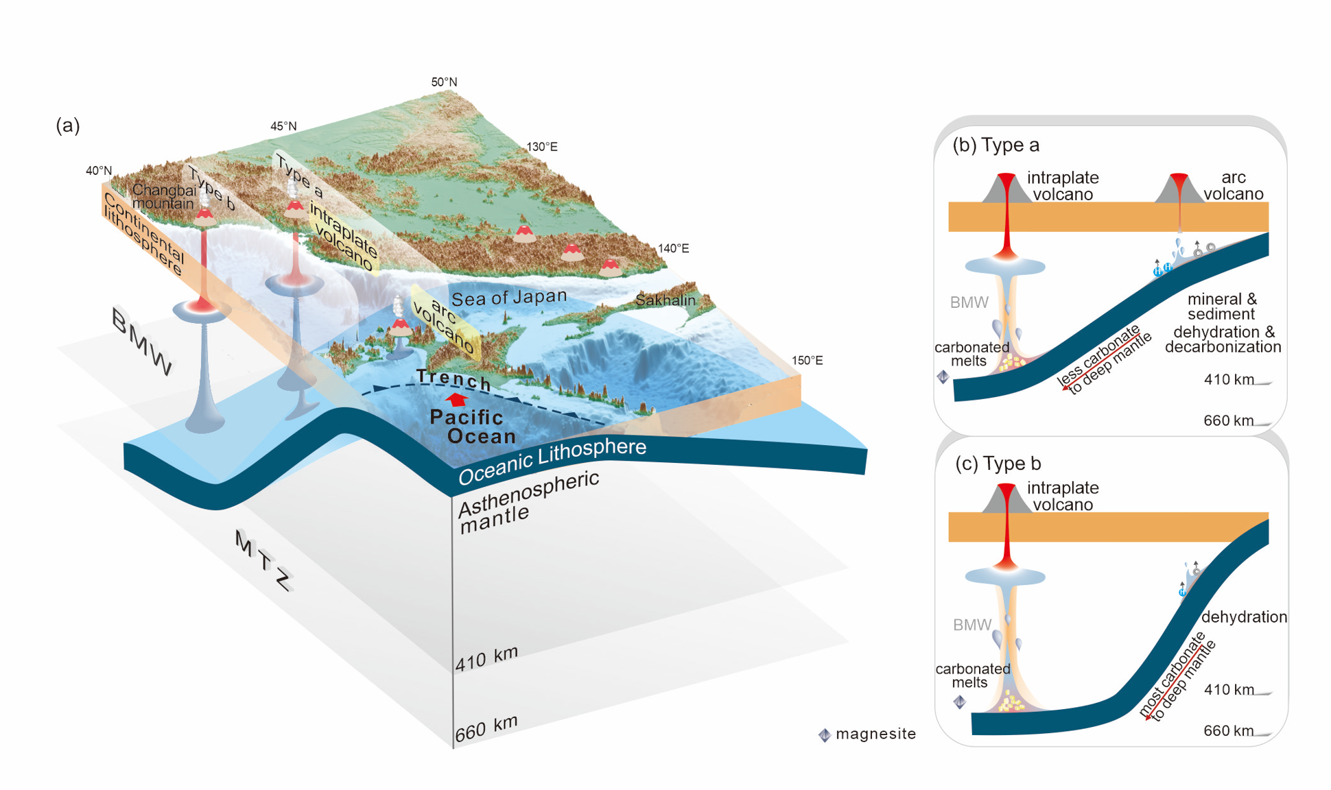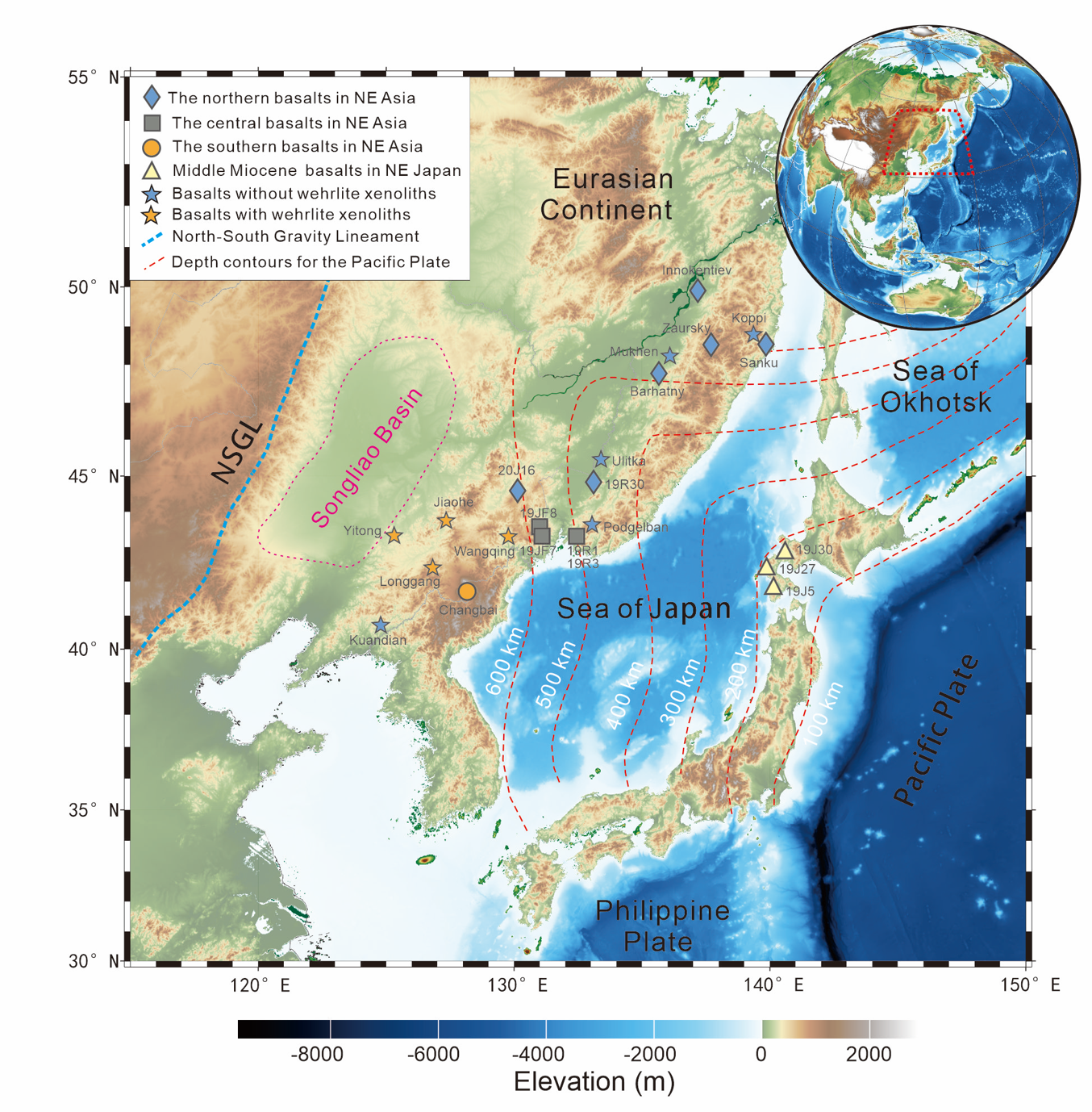 针对这一关键问题,公司许文良教授引领的“太阳成集团tyc7111cc地球深部动力学创新团队”联合中国地质大学(北京)刘盛遨教授,对东北亚陆缘、平行于俯冲带分布的中新世板内玄武岩开展了系统的Mg-Zn同位素研究(图1),结合东北亚陆缘新生代玄武岩中地幔捕虏体的空间分布和地球物理观测资料,为单一俯冲带小尺度碳输入的三维空间变异提供了关键证据。具体研究成果如下: