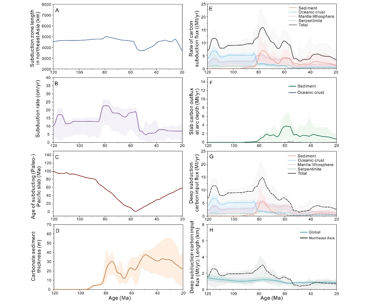 3. 限定了东北亚大地幔楔深俯冲碳循环的时间,揭示滞留板片加速了深部碳循环过程。通过对比分析上述两种模型,发现重建的西太平洋俯冲碳通量及其贡献储层与板内玄武岩所记录的再循环碳量和来源在时间演化上具有一致性,而二者协同变化之间存在平均17 Ma的时间差,代表了西太平洋俯冲碳从俯冲带进入到板内岩浆活动逃逸的循环时间,远低于前人对俯冲碳在深部地幔停留时间的估算。上述结果表明滞留板块能够驱动快速的深部碳循环,意味着晚中生代—新生代早期东北亚上地幔对俯冲-滞留板块中的碳具有相对较高的提取效率,进而能够有效降低上地幔黏度,提升地幔蠕变速率,从而诱发深部地幔流成为控制同时期俯冲带演化的关键驱动机制。
