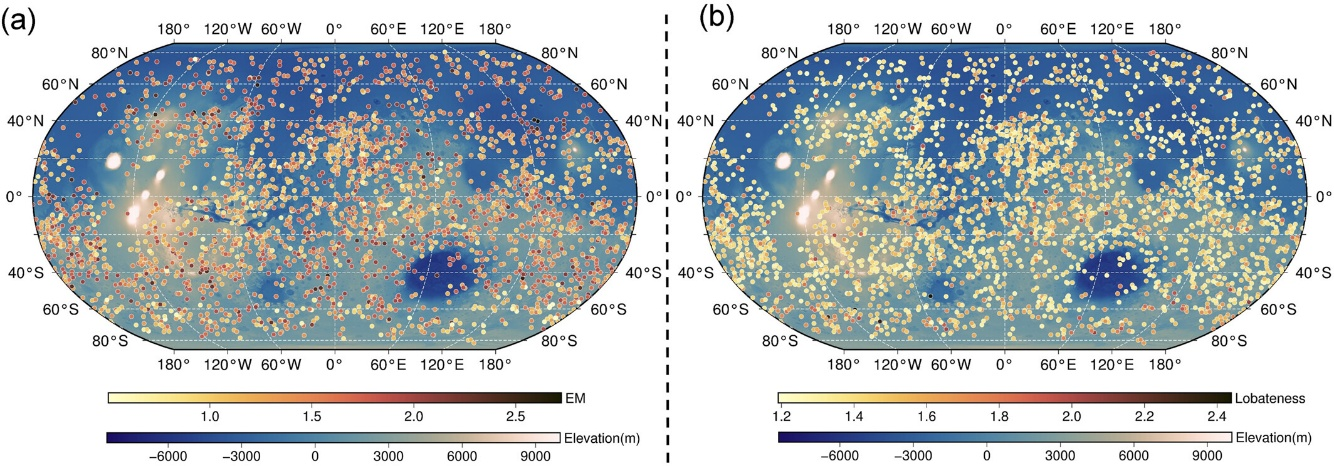 在火星撞击坑层状溅射物(LCE)识别方面,课题组提出了一种新型深度学习模型——EMHSEU UNet。LCE通常呈现层状同心环状溅射结构,其形成与地下挥发性物质(如水冰)密切相关。随着火星影像分辨率的提升,传统人工识别方式难以高效处理海量数据。针对这一问题,该研究创新性地引入高效多尺度注意模块(EMA)和高效上采样卷积块(EUCB),显著提高了LCE的自动识别精度。与传统模型相比,EMHSEU UNet在NASA行星数据系统(PDS)数据集上的表现更加出色。课题组还利用该模型成功更新了罗宾斯火星撞击坑数据库,首次系统性地补充了近3000个撞击坑的关键形态参数(喷出物流动性EM与叶状程度Г),为研究火星近地表含冰沉积物分布及水资源提供了重要依据。
