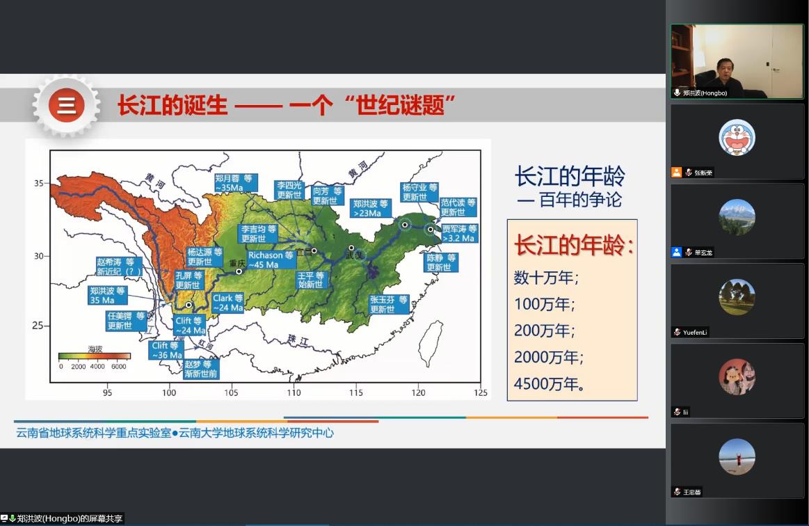 报告中,郑洪波教授表示现代长江的诞生是重大的构造地貌事件,与青藏高原的隆升有直接关系,也是最直接表现,它标志着现代地貌—气候格局(华夏山水)的建立,以及青藏高原东南缘气候环境和生态格局的建立。互动环节中,郑洪波教授就大家的提问,如贡觉盆地和剑川盆地的关系,四川盆地新生代沉积的影响因素、河流转向的动力学机制、以及长江第一湾一带低温热年代学问题等进行解答,对地学师生在传承中华地学人勇于探索、求真务实精神的基础上、聚焦未来地球系统科学前沿、敢于创新方面寄予了希望和期许。