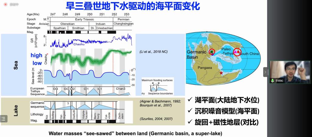 李明松老师对天文年代学、三叠纪旋回地层学以及天文驱动的全球变化三个方面进行了详细的讲述。首先李老师对天文年代学理论进行了介绍,详细讲解了天文参数和天文年代学方法的具体步骤,并以近年来开展的三叠纪旋回地层学工作为例,展示了如何利用旋回地层学的方法来建立高精度的天文年代标尺以及如何进行高分辨率的海陆地层对比。此外还对三叠纪温室时期地下水驱动的海平面变化进行了讨论,提出利用沉积噪音模型来重建高分辨率的古海、湖平面变化和斜率驱动的三叠纪全球变化的理论,并针对地下水驱动的海平面变化这一假说进行了讨论与展望。