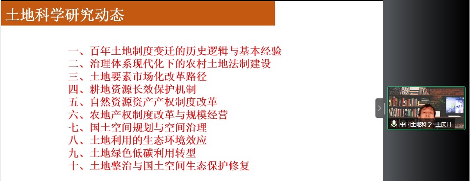 王庆日老师从土地科学研究动态、研究不足和研究展望三个方面进行了详细的讲述。首先,王老师从土地内涵的发展过程引出了土地科学的研究动态,包括百年土地制度变迁的历史逻辑及基本经验、治理体系现代化下的农村土地法制建设、土地要素市场化改革路径、耕地资源长效保护机制、自然资源资产产权制度改革、农地产权制度改革与规模经营、国土空间规划与空间治理、土地利用的生态环境效应、土地绿色低碳利用转型、土地整治与国土空间生态保护修复等十项内容;王老师指出,当前土地科学研究的不足有基础理论研究还相对薄弱、对于土地管理活动运行本质规律的系统归纳尚显不足、土地经济研究对于基础性和应用型问题应对不够等;最后对土地市场体系建设与制度变革、耕地资源用途管制与保护转型、国土空间格局与修复治理、自然资源资产管理与低碳利用等土地科学的重点研究问题进行展望。