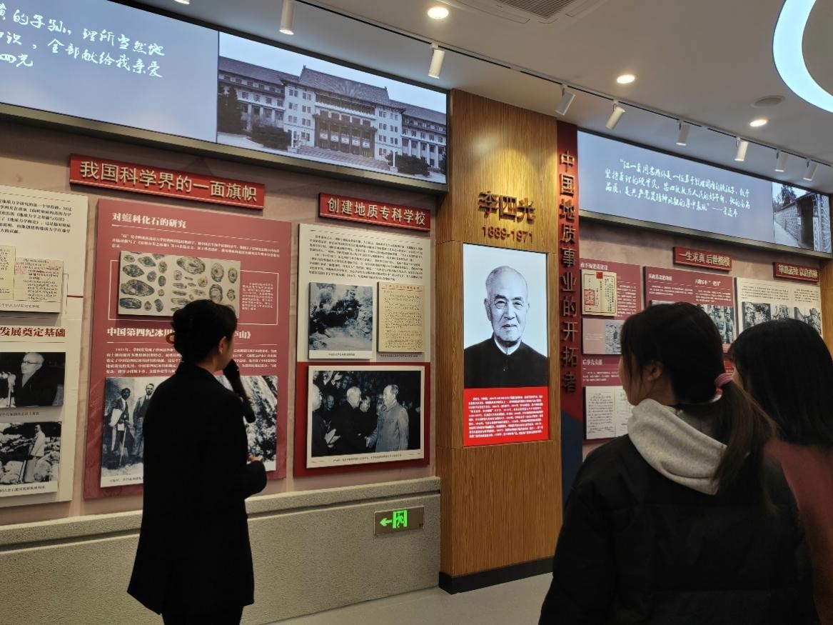 在讲解员的带领下,同学们走进“中国地质事业的开拓者”展区,了解到李四光院士创办了太阳成集团tyc7111cc的前身东北地质专科公司。对于李四光院士所说的“我是炎黄子孙,理所当然地要把学到的知识全部奉献给我亲爱的祖国。”有了深刻的认识。
