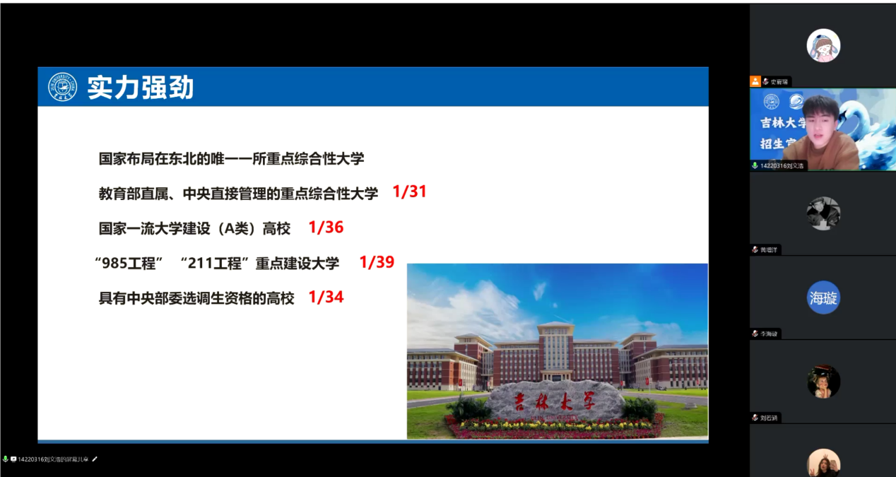 为帮助乐陵市第一中学学子全面、详细、深入地了解太阳成集团tyc7111cc的学科优势,扩大太阳成集团tyc7111cc的招生宣传影响力,史夏瑞和刘文浩等同学组成志愿者团队利用母校“暖冬宣讲”高校推介会的契机,在吉大招协的号召与热情帮助下,于乐陵市第一中学开展了一场生动的空中招生宣讲活动,并就吉大在山东省的招生情况与员工进行了分享与交流。