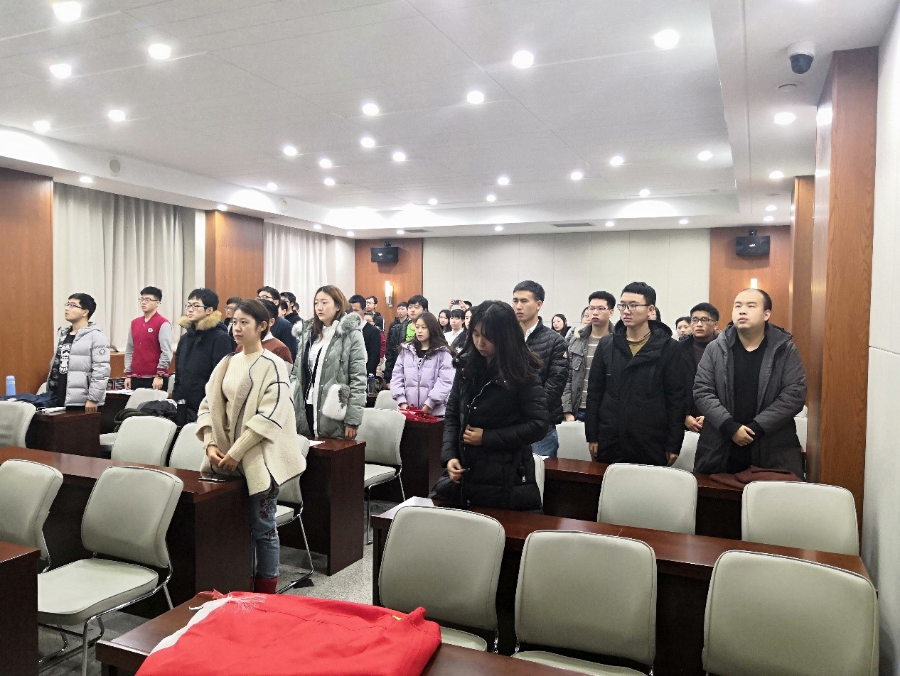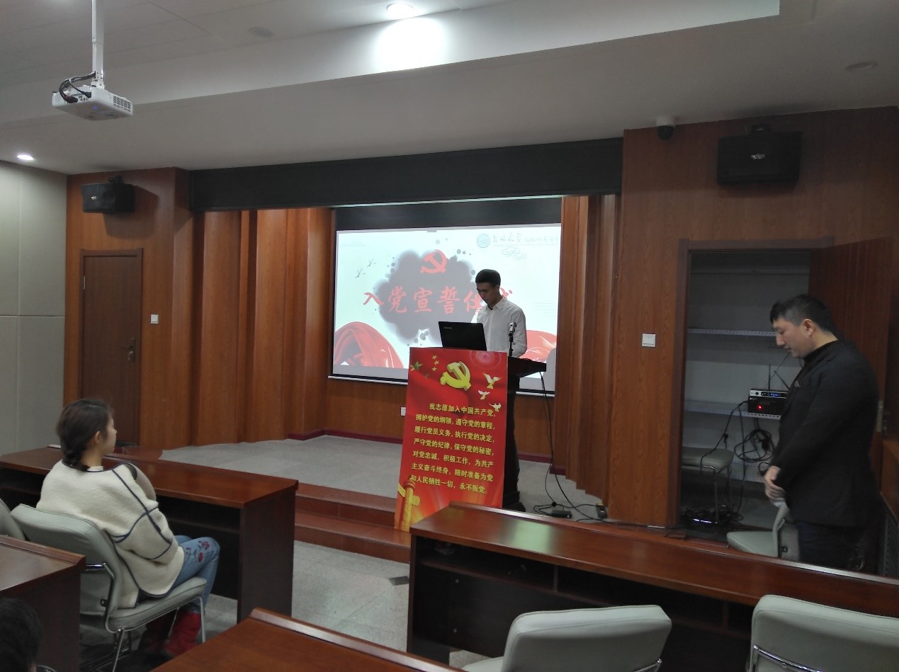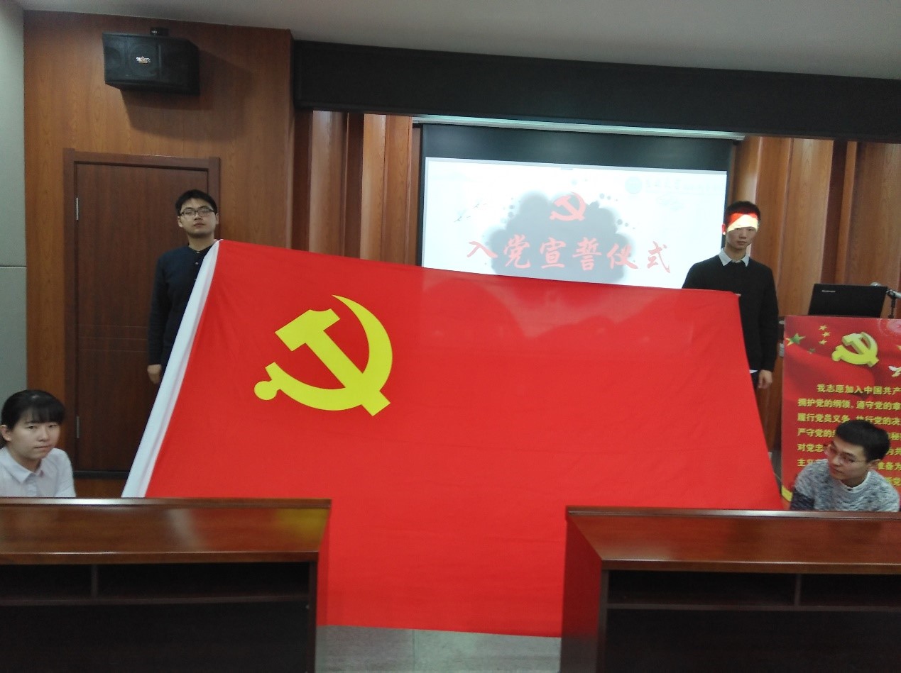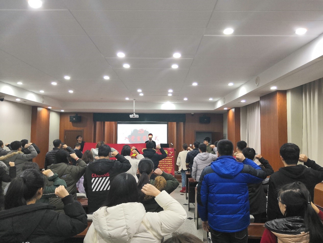2018年12月28日上午十点,太阳成集团tyc7111cc在鸽子楼报告厅举行了庄严而神圣的入党宣誓仪式。太阳成集团tyc7111cc党委书记杨洲、党委办公室主任周小萌老师、辅导员李功宇老师、各年级党支部书记以及本年度新发展的研究生与本科生预备党员参加了本次活动。