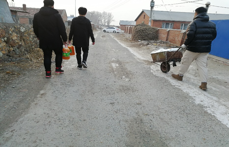 2月10日,团队一行人找到丰富村的书记,说明了此行目的,书记热情地接待了实践团队并为他们讲述了村中老人和儿童的具体现状。针对巴彦县丰富村孤寡老人的生活问题、贫困孩子的读书问题,团队和丰乐乡丰富村的书记进行了对比分析,从中挑选了两家独居的老人,其中一家为贫困户连志忠老两口,另一家为只身一人的张大娘家,又挑选了几家由于经济问题孩子受教育落后的几户人家,将有效经费分成两部分,一部分由关晓彤和邱加男负责为连大爷夫妇和张大娘家购买米面油生活必需品,另一部分为孩子买了笔本学习用品。