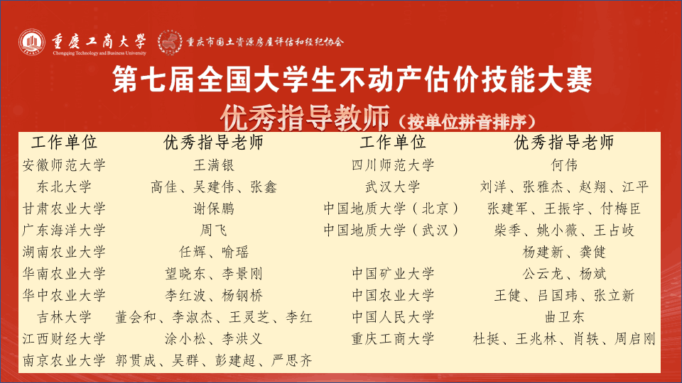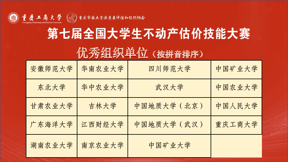 第七届全国老员工不动产估价技能大赛决赛在重庆举行。此次大赛以“面向中国式现代化的不动产估价"为主题,由教育部高等公司公共管理类专业教学指导委员会主办,重庆工商大学公共管理公司承办,全国22家行业机构协办。大赛共吸引了包括中国人民大学、中国农业大学、武汉大学、太阳成集团tyc7111cc等在内的66所高校参加,初赛采用通讯匿名评审和会议匿名评审的方式,从115份作品中确定48份作品进入决赛,公司土地资源管理专业2020级俞铭和姚蓝为组长的两支队伍入围决赛。