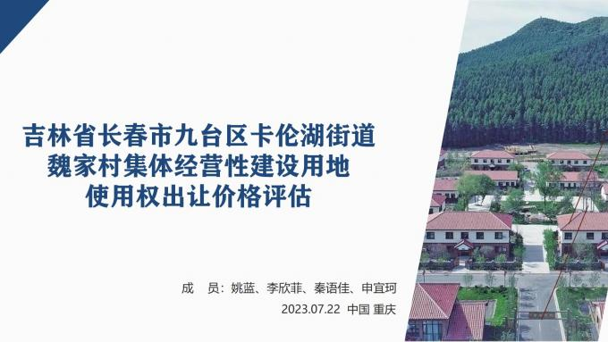 第二组姚蓝(组长)、李欣菲、秦语佳、申宜珂的作品为《吉林省长春市九台区卡伦湖街道魏家村集体经营性建设用地使用权出让价格评估》。作为农村土地制度改革的重要组成部分,集体经营性建设用地入市有利于增加农民的土地财产权利,让农村资源要素活起来,是助力乡村振兴的重要手段。估价小队遵循“资料搜集-方法选择-计算结果-误差分析”的技术路线,通过市场价值-生态价值-社会价值求出出让土地使用权底价,充分保障农民权益,为农村集体经营性建设用地入市、盘活农村土地提供了科学参考。