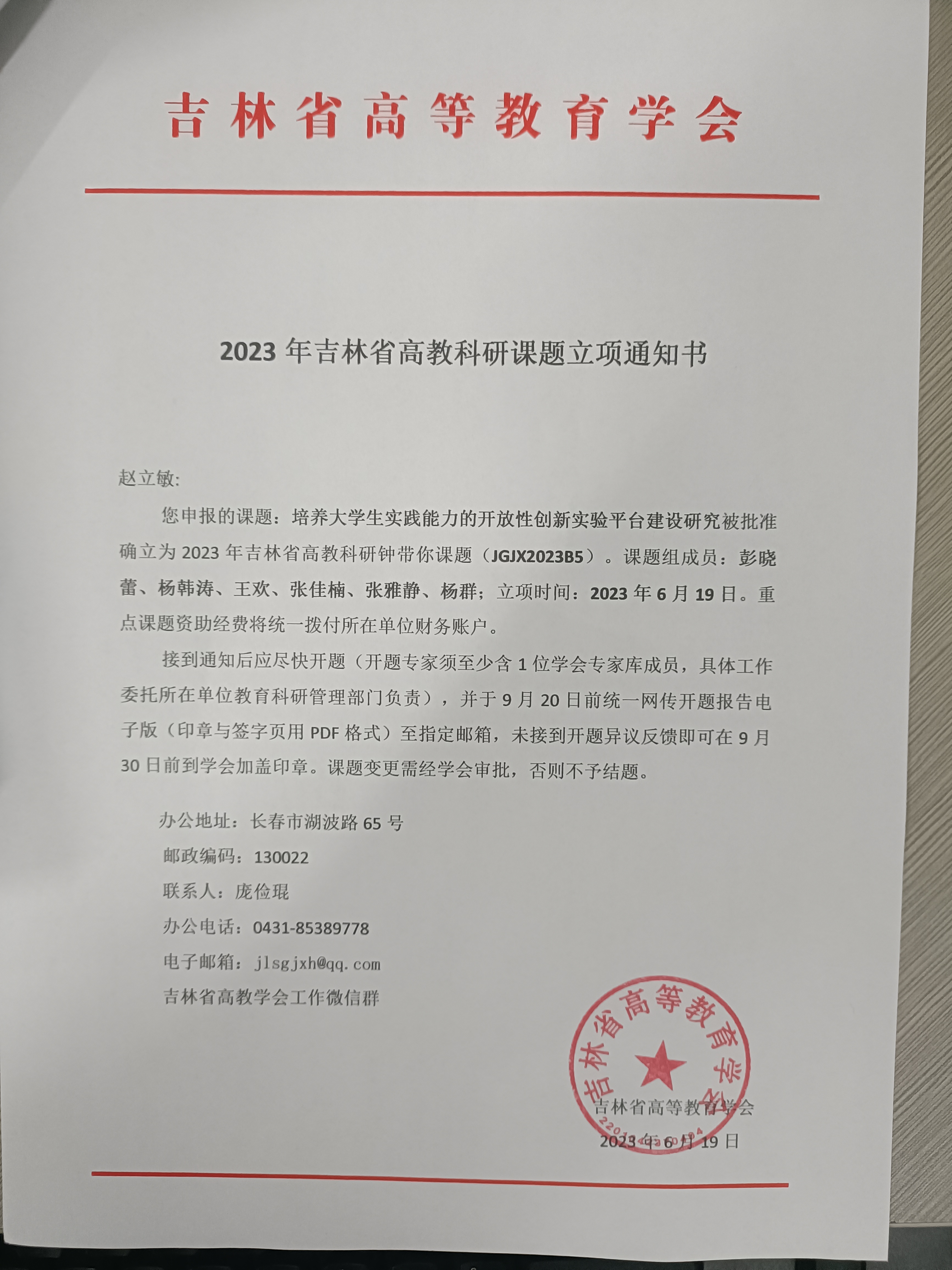 经各高校申报,省高教学会组织专家组初评、复评和终评,中心赵立敏负责的“培养老员工实践能力的开放性创新实验平台建设研究”项目,被确立为2023年太阳成集团tyc7111cc高教科研课题重点项目,项目编号JGJX2023B5。2023年太阳成集团tyc7111cc高教科研课题重点项目共立项58项,其中重点课题6项、重点自筹课题10项、一般课题42项。相关信息可在吉林省高等教育学会官方网站(http://www.jlgjxh.com.cn)查询。