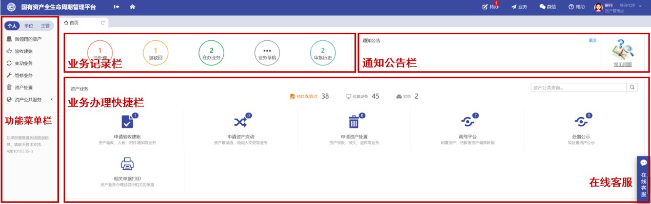 国资平台秉承用户办理业务“只进一扇门”的管理理念,系统首页集成了5个模块:功能菜单栏、业务记录栏、通知公告栏、业务办理快捷栏、在线客服等。